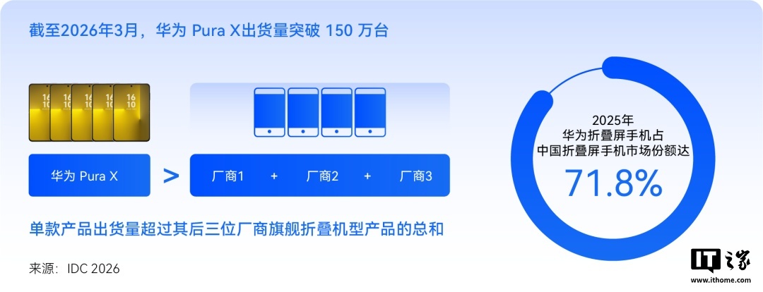据IT之家此前报道,IDC 2026 数据显示,截至 2026 年 3 月底,上市一年间,华为 Pura X 出货量突破 150 万台,单款产品出货量超过其后三位厂商旗舰折叠机型产品的总和。
