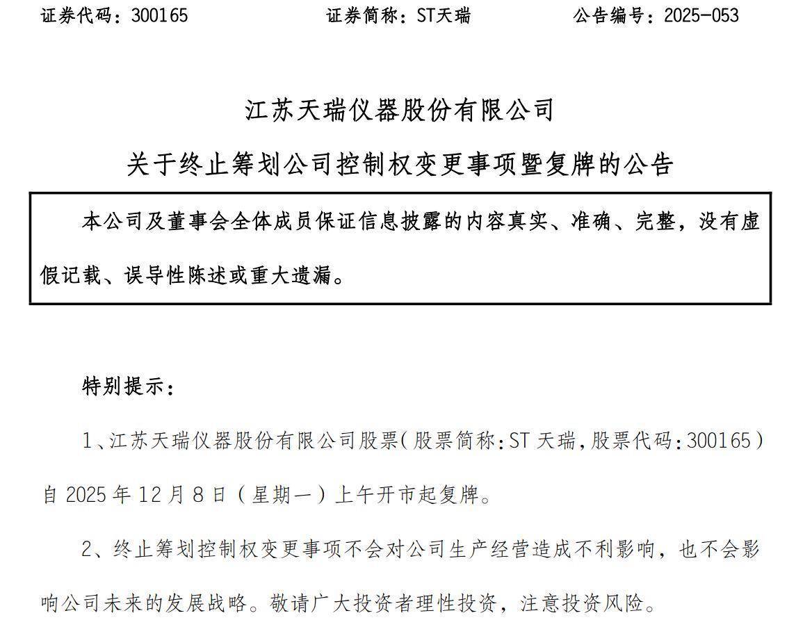 筹划仅一周时间,ST天瑞(300165)控制权变更事项宣告终止。12月7日晚间,公司披露公告称,终止筹划公司控制权变更事项富豪配资,公司股票自12月8日开市起复牌。